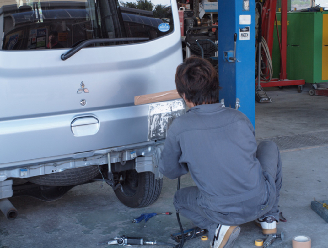 鈑金とは、思いがけないアクシデントで、車のボディーがへこんだりキズがついたりした部分を元の形状に復元していくことです。