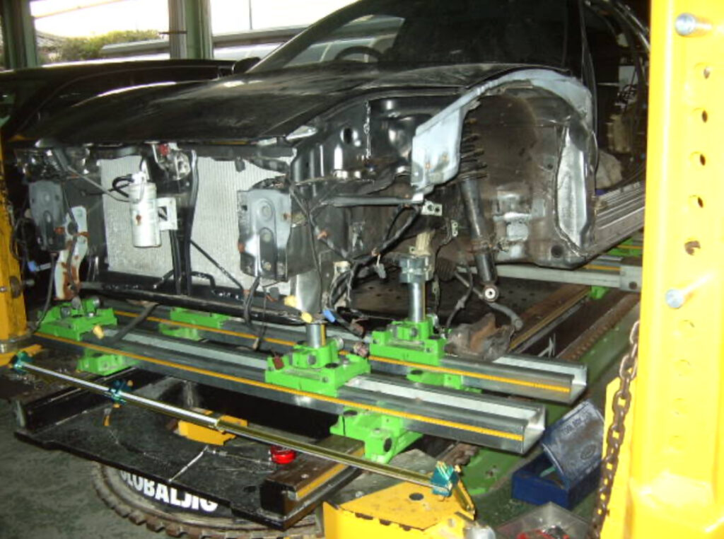 当社ではジグ式フレーム修正機を用いて、メーカーの仕様どおりの寸法合わせて1ミリ単位の修正を行い元の状態に戻るよう修理していきます。